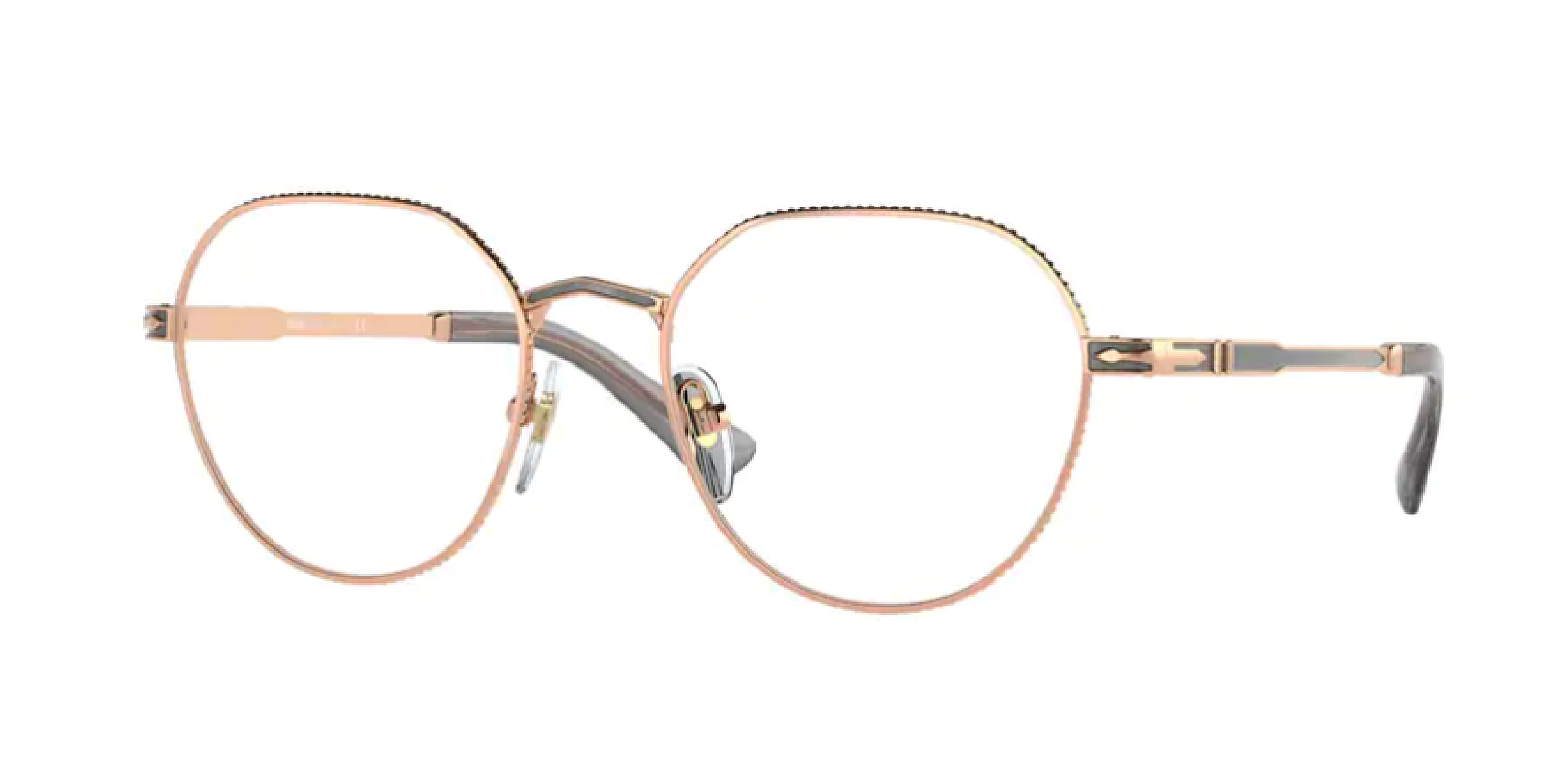 Tyto unisex (pro ženy i muže) dioptrické brýle značky Persol jsou vyrobeny v celorámové, oválné verzi. Designové rámy jsou kovové v okouzlující zlaté, hnědé barvě.
