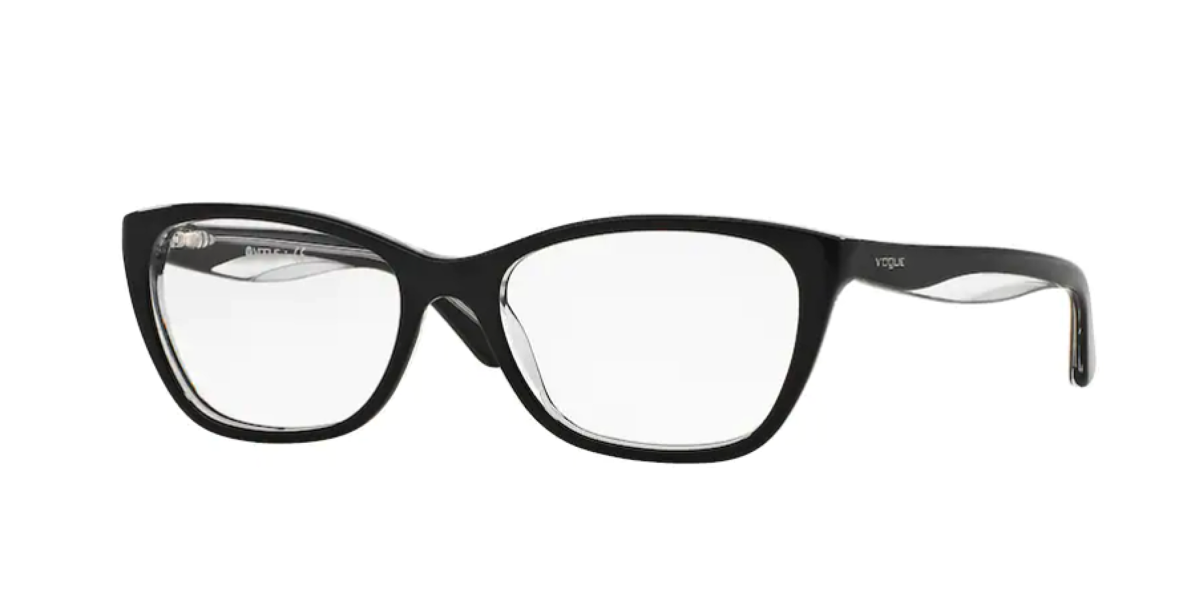 Tyto dámské dioptrické brýle značky Vogue jsou vyrobeny v celorámové, cat eye verzi. Designové rámy jsou plastové v okouzlující černé, průhledné barvě.