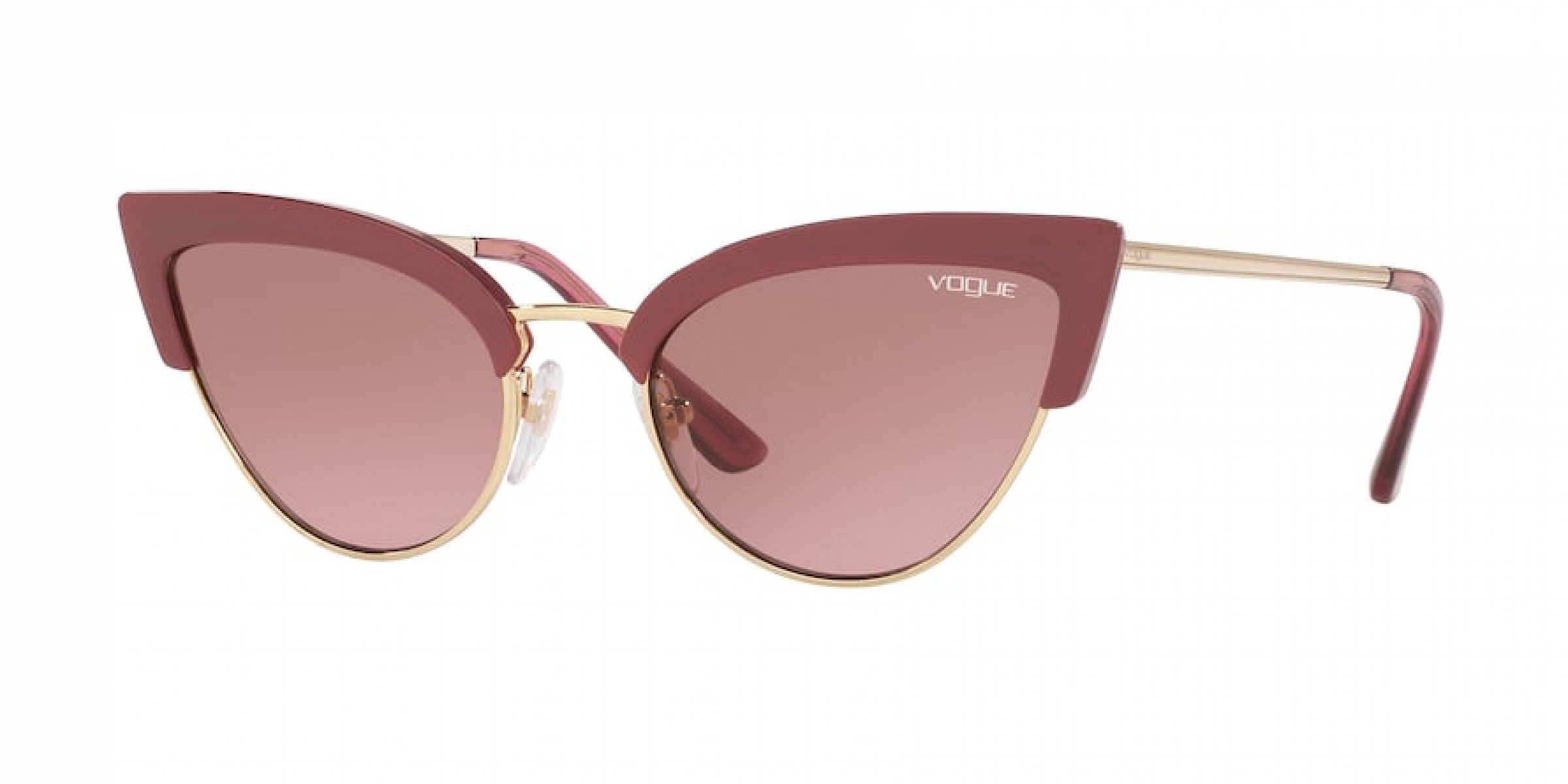 Tyto dámské sluneční brýle značky Vogue jsou vyrobeny v celorámové, cat eye verzi. Řešení čoček je u tohoto modelu standardní v příjemné růžové barvě. Designové rámy jsou kovové, plastové v okouzlující zlaté, růžové barvě.